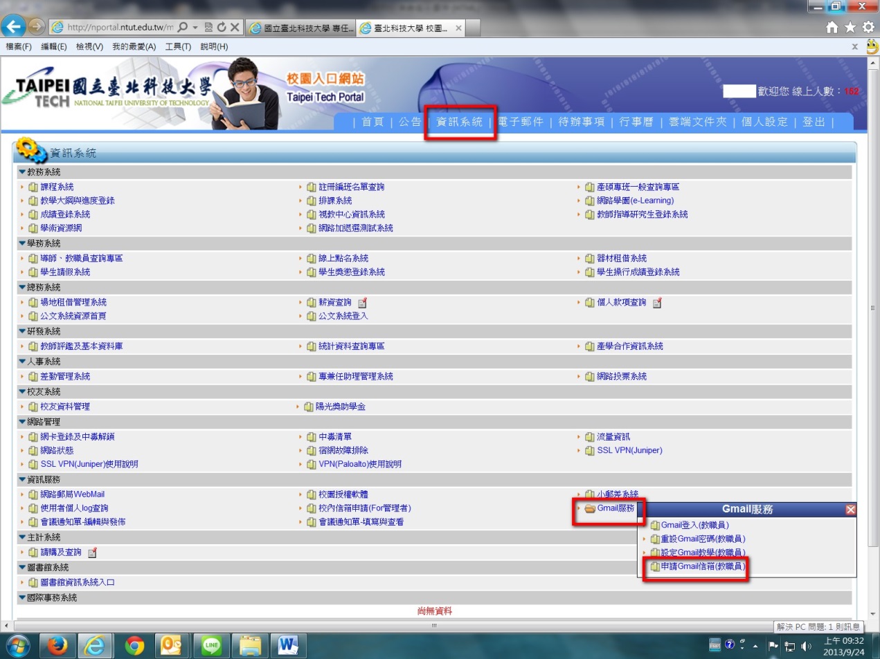 2. 資訊系統 → Gmail服務 → 申請Gmail信箱。閱讀規範後「打勾」並點選「我要申請」。